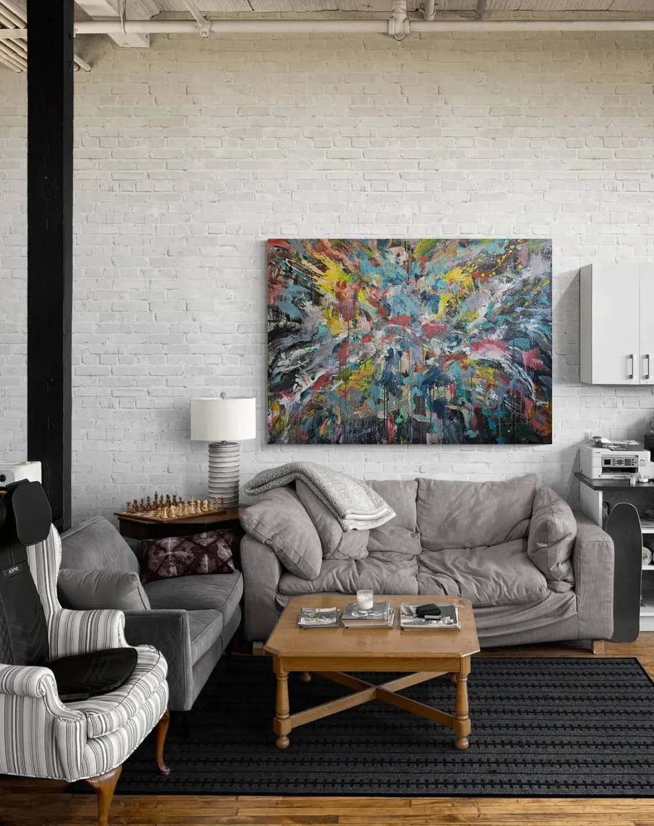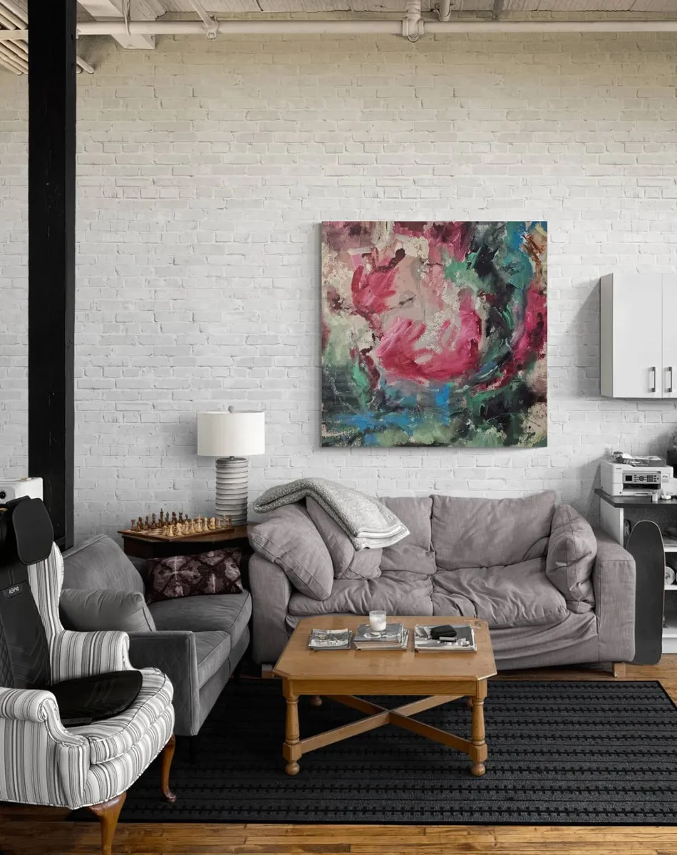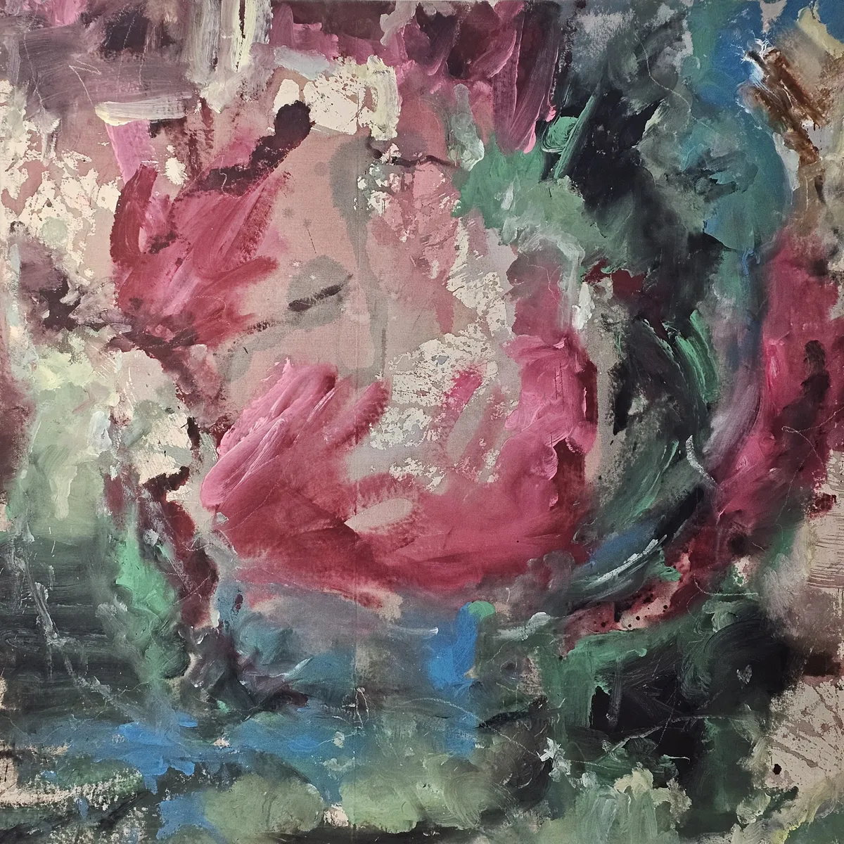 Acryl auf rohem Leinwand, sorgfältig per Hand bespannt. Das Werk ist Teil des Diptychons "Gesucht und Gefunden" und symbolisiert den Zauber, der zwischen frisch Verliebten entsteht.