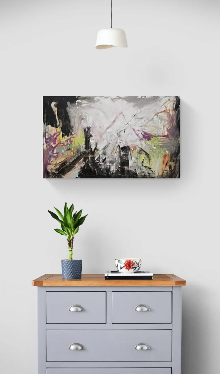 Ich würde sagen, dies ist eins meiner leichten Sommerbilder, obwohl der starke Kontrast den pastelligen Farben ordentlich Kraft verleiht. Dieses Bild ist an nur einem Tag entstanden und sehr intuitiv. Eher eine Lockerungsübung, die selbst von einer Skizze inspiriert wurde. Mir gefiel zuvor eine lose, abstrakte Zeichnung aus meinem Skizzenbuch. Mir waren die Handbewegungen, die ich ganz frei beim Zeichnen gemacht habe, noch gut in Erinnerung, besser gesagt: im Gespür. Also mischte ich nach Gefühl eine frische Farbpalette mit Fliedertönen, Sandfarben, einem zarten Blattgrün und einem lichten, warmen Grau, dass mich an einen leicht verhangenen Sommermorgen denken lässt. Manche der gemischten Nuancen entstanden dann erst während des Malprozesses, der teilweise beidhändig ausgeführt wurde, um so gut es geht die Kontrolle über die Strichführung abgeben zu können. Für die braunschwarzen Akzente griff ich zielrichtig nach einem Plastikspachtel und fertig war das Bild, das nun von einen klaren Kompostion bestimmt ist, der Leinwand durch einen dünnen Farbauftrag viel Luft zum Atmen lässt und ebenfalls Ähnlichkeit mit einer fernen Bergkette im Nebel oder auch einer Großstadtkulisse hat. Daher wollte ich es erst "Stadt, Land, Berg" nennen. In Anlehnung an das Ratespiel, denn dieses Gemälde symbolisiert für mich eine suchende Reise. Letztendlich habe ich mich für den Titel "Der Beginn der Wanderschaft" entschieden, denn das entspricht der Leichtigkeit des Gemälde, was teils noch grundierte Leinwand durchschimmern lässt. Es ist ein Beginn einer Reise oder Wanderschaft, die vielleicht später beschwerlich wird, aber jetzt noch mit frischen Kräften in Agriff genommen wird.